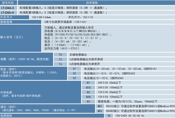 ¤ 可選:4點報警,2路變送輸出、通訊接口、運算結果顯示/報警/變送輸出、外供變送器電源