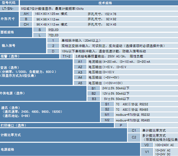 ¤ 7位或5位LED 顯示可選,7位顯示:顯示范圍-999999~9999999,5位顯示:顯示范圍-19999~45000