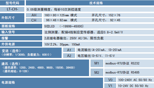 LT-CH 力值顯示器與各種稱重/測(cè)力傳感器配合使用,實(shí)現(xiàn)重量、力的測(cè)量、顯示、變送及報(bào)警控制等功能。帶面板清零、峰谷值保持功能;(一臺(tái)儀表可接1-4臺(tái)稱重傳感器,進(jìn)行總重量測(cè)量顯示。)