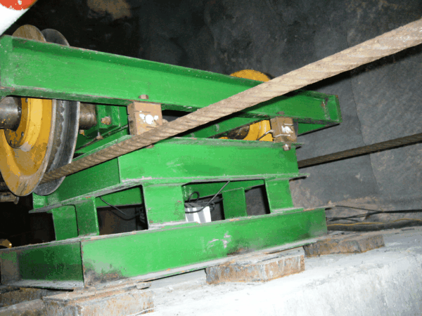 礦山開采及水電站(蓄能電站)等工程“深井”(文中百米以上“豎井”;“鈄井”簡稱:“深井”)施工中,多用卷揚機通過鋼纜牽引“行車”或“吊籠”,運送施工人員和物資,運出礦石或廢料,這套牽引系統(tǒng)在國內(nèi)深井施工中被廣泛采用。因無可靠的安全監(jiān)控手段,又要避勉發(fā)生載人載物時超重;“行車”、“吊籠”脫軌或卡壁運行時,使鋼纜張力陡然增加,造成意外事故(輕者牽引設(shè)備損壞,重者車毀人亡)。目前通用防范辦法,采用在增大鋼纜抗斷裂張力的基礎(chǔ)上,加大安全系數(shù),一但發(fā)生事故,各工地都有不同的補救辦法,防止事故擴大,但因不能預(yù)報和防止事故發(fā)生,系統(tǒng)安全問題仍然存在。